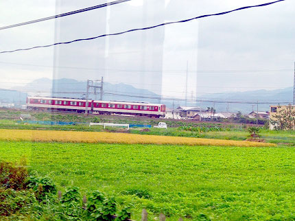 私が乗っている各駅停車と黄色い近鉄特急は、ほぼ同時に発車した。ここからしばらく近鉄の線路と並んでいる。あちらは特急だから勝ち目はない。引き離されてしまう。鉄橋を渡り、近鉄だけ駅があり、また鉄橋を渡ると、近鉄の線路とはお別れである。