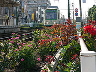 薔薇を植えた区間は三ノ輪橋から5つめの町屋駅前まで、と案内図にある。しかし見頃の時期ではないようで、生け垣に1本ずつ程度しか咲いていない。植え込みは線路際に留まらず、付近の建物の線路側にも見られる。沿線全体で薔薇を植えようと協力しているのだろうか。5月頃には見事な花道になりそうだ。