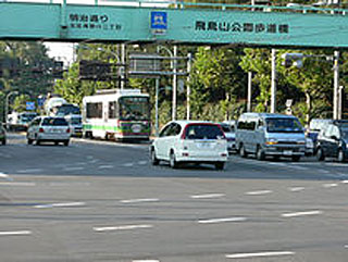 荒川線の線路は東北本線のガードをくぐり、32系統の線路を進む。ここから飛鳥山電停までの短い区間が道路併用区間だ。路面電車の面影が残り、荒川線の紹介記事でよく見かける風景である。写真飛鳥山公園に沿った道はかなりの勾配だ。路面電車といえば平坦な所を走るものだと思っていたけれど、電車はぐいぐいと上っていく。が、左車線の自動車にあっさりと抜かれてしまう。