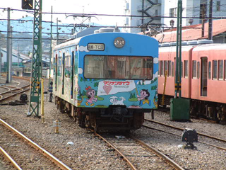 上信電鉄の電車。塗装は「こんにゃく畑」の広告だ。