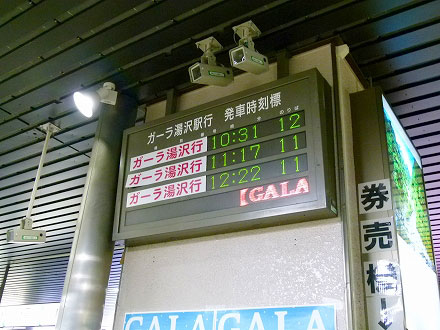 新幹線改札口に入ると、新幹線とは別に小さな発車案内表示器が架かっていた。ガーラ湯沢行きの発車時刻が三つ。予定通りの運行で安心する。ただし、一番下の案内欄はガーラ湯沢スキー場営業休止とある。やっぱりゴンドラには乗れないらしい。それにしても、目的地のスキー場が休みで、なぜ列車は走るのだろうか。鉄道は勝手に運休してはならぬというお達しだろうか。いや、従業員など用事のあるお客がいるのだろう。そんな考えをめぐらせながらホームに上がる。