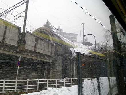 スキー客の心配はどうでもいい。彼らには気の毒だが、私の目的は線路である。進行方向左側の窓際に座った。たったひと駅だけど、このひと駅のために朝早く家を出て、4時間も各駅停車に揺られてきた。しっかり見届けよう。列車は静かに走りだす。外は雪景色。線路は上越新幹線の複線の外側、もっとも左の線路を走る。しまった、こっちの窓から線路の模様は見えないか。こちら側は雪が積もった商店ばかり。