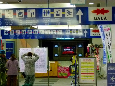 改札口を出て、通路はそのままスキー場のフロントにつながっている。その先がロビーだ。スキー場の案内放送で、営業休止と他のスキー場への振り替えを説明している。なるほど、通勤電車の振り替え輸送と同じで、スキー場も休止すると付近のスキー場に振り替えてもらえるらしい。それで列車は動いていたわけだ。階段を降りていくと、他のスキー場の送迎バスを待つ人々がいた。