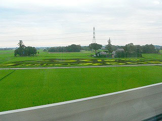 車窓は森から水田地帯に変わっている。私は進行方向左側に注目した。行きの取材列車で"田んぼアート"があるという車内放送があったからだ。田んぼアートとは稲の色の違う品種を植えて、水田に絵柄を作るという催しだそうだ。行きは取材に集中していたのでよく見えなかった。今回はきちんとカメラに収めたい。背伸びして前方を見据えていると、田んぼの色が変わる部分があった。つくばみらい市、と書いてある。市町村の合併を記念したもののようだ。