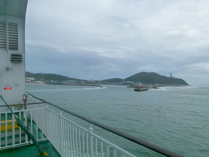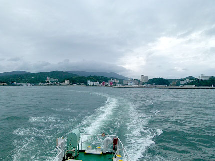 船旅は海と空が延々と続くだけで変化に乏しい。しかし、国内の沿岸航路は別だ。陸地や島が見えるから、外洋航路と違って景色が楽しい。読書や昼寝で過ごすより、やっぱり景色を見たい。後部デッキに出ると、上部甲板にも上がれた。ただし、一般客は船体の後部まで。船首方向は特等専用となっていた。前が見たければ320円の特別料金が必要だ。まあ、後ろで十分だろう。所要時間は55分である。