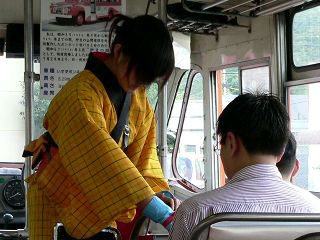 海を背に山道を行く。国道414号線に入るとさらに道が険しくなる。踊り子さんは黙っている。観光ガイドのような語りはなく、車掌乗務に専念しているようだ。彼女が観光ガイドをすると、観光バス業者が困るのかもしれない。しかし愛想は悪くない。降りる客を笑顔で送り、乗る客を礼で迎える。ただ、お客の席へ切符を売りに来るときの表情は真剣だ。バスに揺られながらお金のやりとりをしなくてはいけない。そして先頭に戻ると、メモを書いて運転席に挟む。お客が降りる停留場を知らせるのだ。このバスには案内放送も下車通知ボタンもないからである。