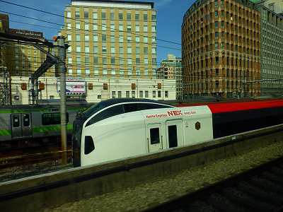 自宅から東海道新幹線に乗る時は品川駅が近いから、東京品川間の新幹線は久しぶりである。通勤電車で見慣れた区間だけど、新幹線は少し高いところを通る。車窓がちょっと違う。有楽町駅付近で赤い屋根のE259系電車を追い越した。成田エクスプレスは地下の横須賀線を走るはず、なぜ東海道本線を……と思ったら、伊豆急下田行きの臨時列車、マリンエクスプレス踊り子号だった。側面のLED表示器にもしっかり列車名が書かれていた。字幕なら"臨時"だったろう。LEDは便利だ。旅の始まりから珍しいものを見た。