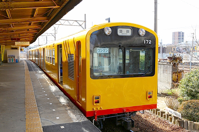 北勢線は30分間隔で運行しており、終点の阿下喜駅行と途中の楚原駅止まりが交互に発車する。阿下喜へ行く電車は1時間おきとなっている。次の列車は12:35分発の楚原止まりだ。そこへちょうど黄色い電車がやってきた。さて、これに乗るか、見送って阿下喜行きを待つか。