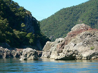 このところ好天が続いたせいか、水流は穏やかだ。時々"早瀬"と呼ばれる急流があって少し揺れる。ガイドブックには"スリル満点"と書かれているけれど、至って穏やかで水もほとんど被らない。乗客が少なく舟が軽いから、簡単に浅瀬をクリアしてしまうのかも知れない。
