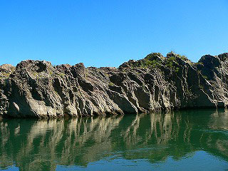 客に子供がいるせいか、船頭さんの岩の説明にライオンやゾウなどの動物が登場する。動物の形はこじつけのような気がするけれど、たしかに面白い形の岩が次から次へと現れる。自然の彫刻とはよく言ったもので、庭師なら岩に値段を付けながら見物するかも知れない。晴れているから水面に岩の姿が映っている。水の青、岩肌の影、そこに覆い被さる森緑の濃さ。日本という国のなんと美しいことか。