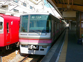 名鉄小牧線の電車は銀色の車体にピンクの帯が入っている。名鉄の車体は真っ赤が基本だが、小牧線では地下鉄との乗り入れを機会に、この独特の車体を使っている。名鉄らしくないと思うけれど、よく見ると車体番号の書体が伝統の飾り文字風である。新しい電車で、車内も清潔感がある。路線のテーマカラーに合わせて、手摺りやウインドウスクリーンもピンク色。産婦人科の待合室のようだ。