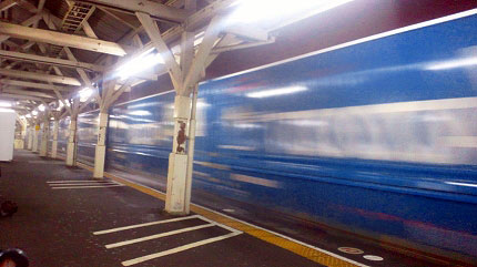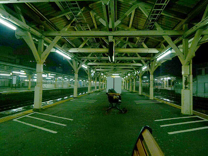 「私はみなさんと同じ気持ちではないのでホームに戻ります」と告げた。二人ほど、「えっ」という表情を見せた。私は彼らに背を向けて歩き出す。こんな所で、恨みのない駅員さんと睨み合うよりも、夜のホームで、明かりに照らされて濡れそぼつレールを見ていたほうが楽しいと思われた。そして実際はもっと楽しかった。貨物列車が次々に現れた。大雨で抑止させられただけではなく、旅客列車の後回しになっていた貨物列車たちが、西へ東へと動き出していた。鉄道全盛時代を思わせる活気だった。