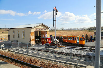 その奥の展示小屋には、壁いっぱいに写真や説明ポスターが並んでいた。目を下ろせば信号てこ、電車の模型、軽便鉄道時代の筆書きの書類などが並んでいる。見入っていると、いつのまにか別の黄色い帽子の男性がそばに居て、挨拶をするといろいろと説明してくれた。ありがたいことであるし、彼も嬉しそうな様子であった。
