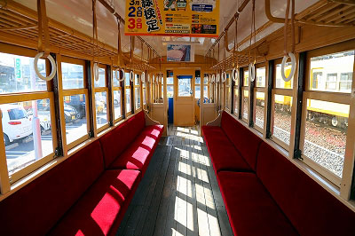 展示用の小屋の手前に煉瓦色の電車が佇んでいる。226という番号が入っている。1931年に北勢鉄道が導入した電車で、1977年まで活躍した。その後、近鉄によって北勢線に新型車両が導入されると、内部線・八王子線に移籍。1983年まで使用された後に廃車、静態保存となった。2008年にこの地に移された。車内外が復元され、きれいな姿だ。青空に車体の赤色が映え、下回りは新車のように明るいグレー。今にも走り出しそうだ。そして車内も見学できる。車体は鋼鉄、内装は木製。肘掛けに彫り物もある。贅沢な作りであった。
