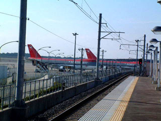 その予想は大当たりだった。線路も空港も有刺鉄線に囲まれているが、地上に出たとたんにジャンボジェットがこちらを向いている。アメリカのノースウェスト航空の赤い機体がふたつ並んでいた。まるで空港内を遊覧しているようで楽しい車窓だ。しかし、もうすこし見ていたい、と思うところで芝山千代田に着いてしまった。