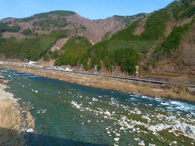 トンネルのこちらも春の陽気だ。山肌に雪がない。満腹で列車に揺られ、窓から陽光が降り注ぐ。天の恵をありがたく頂いて、しばしまどろむ至福のとき。飛騨川に車窓も変化に富んで楽しい。しかし眠い。渚駅。なぜこんな山の中に渚だろうか。飛騨川の水運に関係があるのかな。そういえば渚あられって旨いな……。思考が散っている。