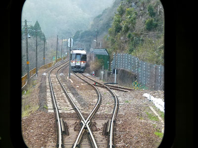 飛水峡信号場で特急と交換