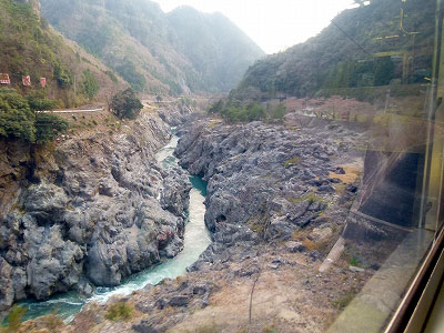 信号場の先の景色、細い川の両岸をゴツゴツとした岩が挟む。対岸の崖に飛水峡と書いてあった。寝覚の床のような風景だが、平らな岩はない。岩場のところどころに虫食いのような穴がある。川に運ばれた小さな岩が当たり、小さなひび割れにはまってくるくると回り、円形に削っていく。これを甌穴(おうけつ)というそうだ。自然の彫刻が作った絶景。立ち止まってゆっくり見たい景色である。さっきの信号場の名前は飛水峡信号場。駅にして、観光シーズンだけでも乗降できたらいいのにと思う。