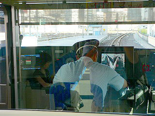 ホームに上がると銀色の真四角な電車が待っていた。JRの新型通勤電車に準じた設計なのだろう。コーポレートカラーの青色を纏い、前面は黒でまとめた精悍なデザインだ。最近は何でも曲線を多用した外観が流行のようだけれど、この車体は直線を基調とし、私の好みのデザインである。さっそく乗り込み、空いた車内を先頭車まで歩いてみた。運転席の後ろの窓は開放されているから前方が良く見える。運転台には大きなモニターがふたつあった。コンピューターで制御され、必要な情報を画面に呼び出して使うのだ。最近の飛行機風に言うとグラスコクピットである。ワンマン運転なので、モニターのひとつは駅に停車中のホームの様子を映していた。