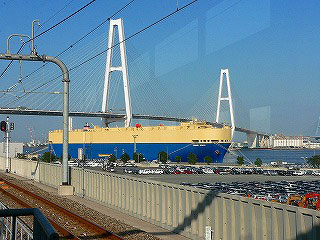 名古屋競馬場前、荒子川公園あたりの車窓は住宅ばかりだが、稲永付近から工場や倉庫が混じり始める。もうすぐ埠頭ですよ、という前触れだ。野跡からは運河と船も見えて、いよいよ埠頭の終着駅が近づいてくる。高速道路を潜ると車窓の岸に同じ型の自動車かたくさん並んでいる。そうか、世界のトヨタ車はここから船に積み込まれるのだ。窓のない、真四角でぼってりとした巨大な船が横付けされていた。あおなみ線はここまで貨物列車を走らせない。工場で生産されたクルマが、貨物列車で港に来る日は復活するだろうか、と思う。