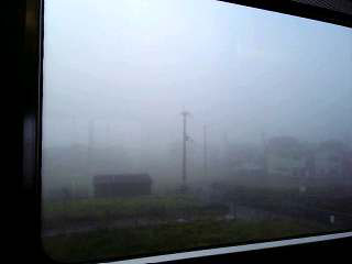 大阪へ向かうラストスパート。銀河は朝霧に包まれた。束の間のミルキーウェイ。小川や木の多いところだけが濃霧で、住宅の多いところは晴れている。夜明けから朝までの景色の変化は楽しい。しかもその楽しい時間は一瞬だ。長い夜を駆け抜けた者だけが見える景色。夜行列車の楽しみは、夜を走ることではない。朝を列車で迎えることなのだ。