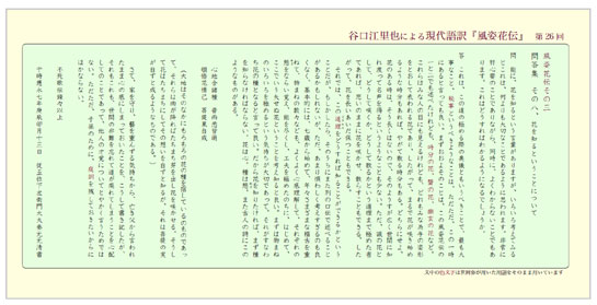 答 これは、この道の極める際の奥儀ともいうべきことで、最も大事なこと、秘事というべきようなことは、ただただ、この一時にあると言っても良い。まずおおよそのことは、この風姿花伝の一と二でも述べたけれども、時分の花、聲の花、幽玄の花など。(本文テキストへつづく・・・)