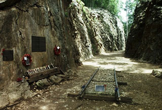 この地には今でもこの鉄道に関わる重労働と戦争時の傷跡を紹介する博物館が建っているのだが、もちろん鉄道自身も今でも残されていて、その線路の上を走る汽車に乗ってみることができるようになっていた。この列車の最大の見所はなんと言っても泰緬鉄道建設時最大の難関であったとされるアルヒル浅道橋だろう。クワイ川に迫り出すように聳える崖の脇を、木を組んで作った浅道橋が続く場所である。