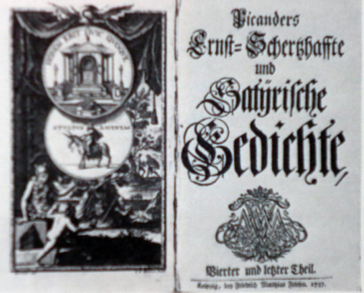 このピカンダーとは仲が非常に悪かったとされる、前述したクリスティアーネ王后の追悼ミサ曲の作詞家ゴットシュートという当時ザクセンの代表詩人は、宗教臭が強く、ピカンダーの軽い、言葉の遊び的な詩を全く評価せず、手厳しく批判している。が、ピカンダーも次第にキリスト教に啓発された詩を書くようになるのだが…。