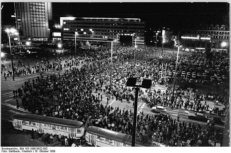 それは1989年10月9日の夕方の6時のことだった。ニコライ教会に人々が集まり始めた。主導的なオーガナイザーがいたわけではない。自然発生的に自由を求め、民主主義的社会、政治を要求しただけだった。参加した人々も、頑とした共産体制を崩そうと意図していたわけではなかった。おそらく口コミで“ニコライ教会で市民が集会を開いているぞ!”と広がったのだろう。じきに、ニコライ教会は満杯になり、そこに入り切らない市民が通りに溢れ、近くのカール・マルクス広場までビッシリ埋まるほどになったのだった。結果7万人もが集まったのだ。